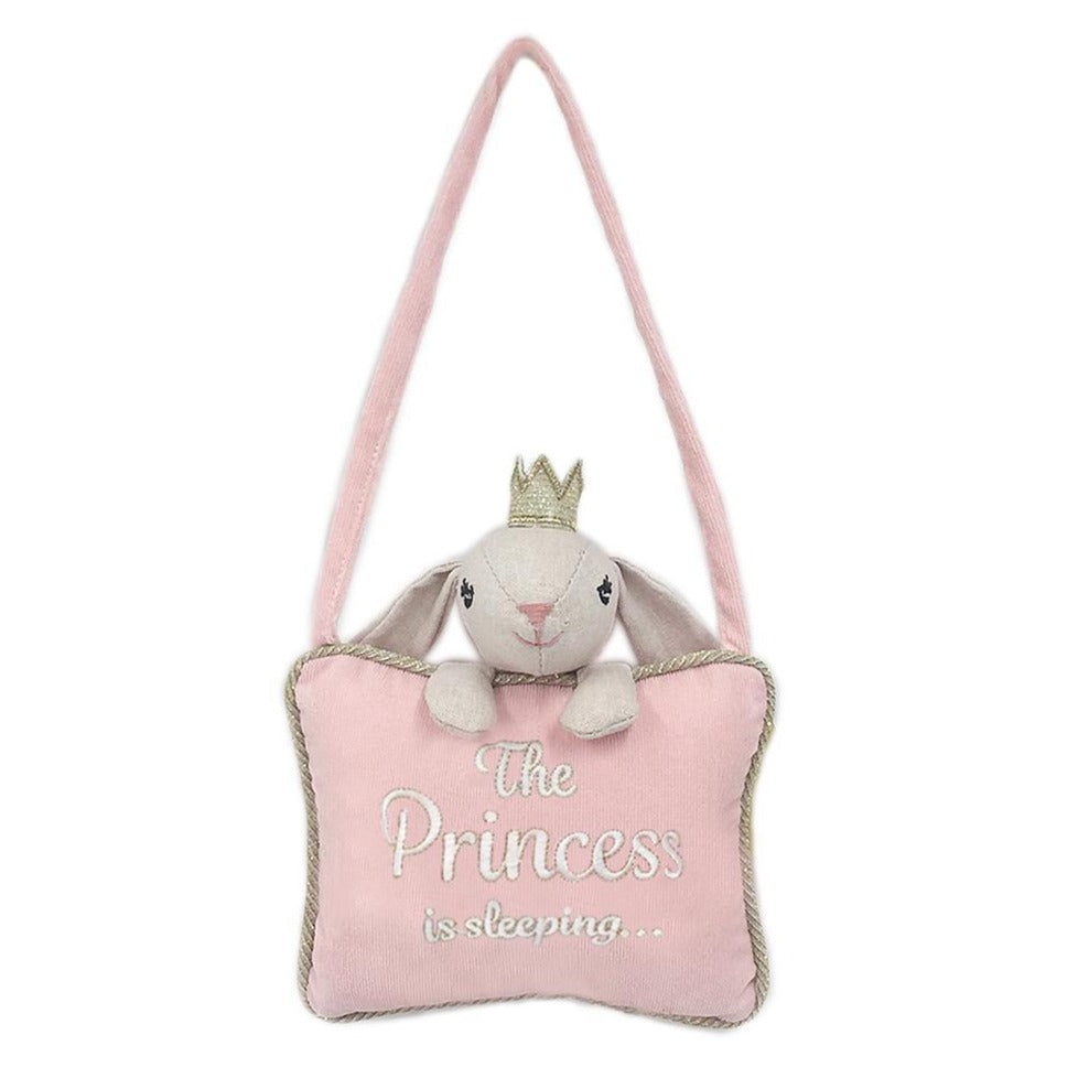 Shhh...The Princess is sleeping! This beautiful little pillow is perfect to hang on a knob, crib, or door. Made of soft pink corduroy, our signature gold fabric piping, 3D bunny and hanger loop, a must for every Princesses. bedroom. Pair as an accent to our nursery collection!