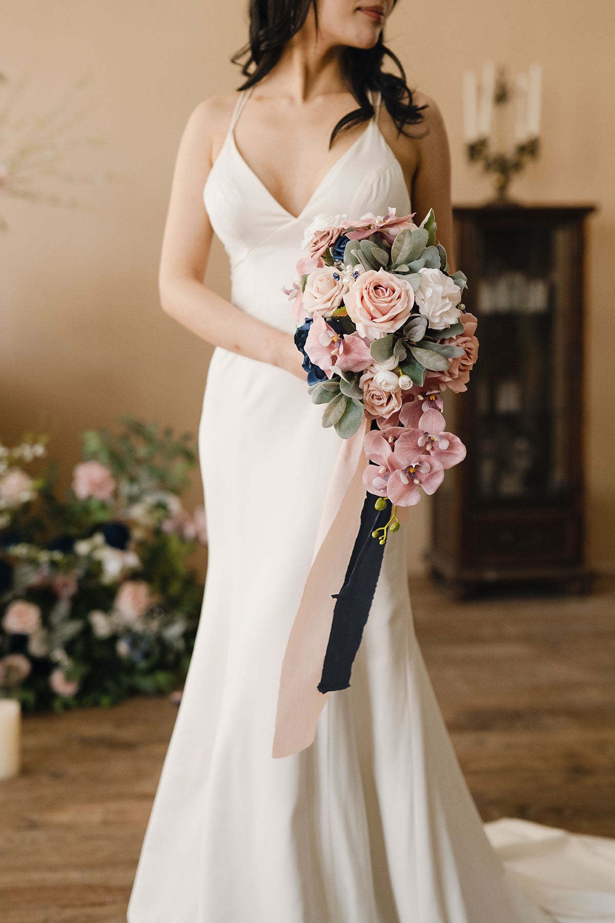 Small Cascade Bridal Bouquet in Dusty Rose & Navy