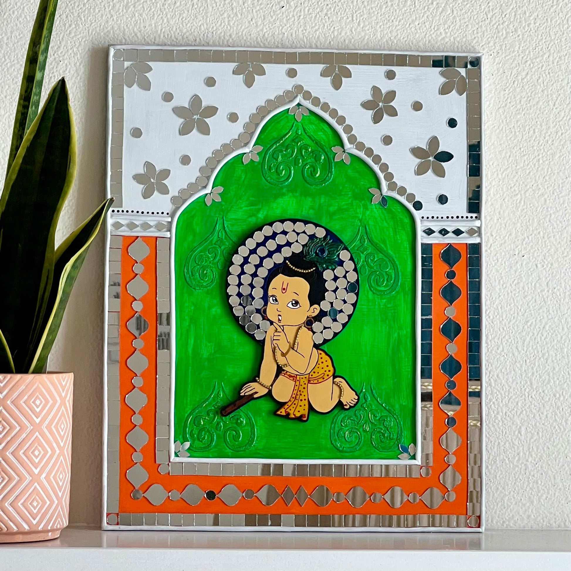 Lippan Art Wall Hanging - Add a touch of traditional elegance to your home decor with this handcrafted baby krishna Lippan Art piece. Made using clay and mirrors, this wall hanging is traditional mural craft of Kutch, Gujarat known as Lippan Kaam. Its bright colors are sure to grab attention and create an ambiance of sophistication in any room it's displayed in. Whether it's for your living room, drawing room, or bedroom, this wall hanging is perfect for adding a touch of Indian charm to your space. Lippan art also makes for an excellent gift for housewarming, Thanksgiving, Christmas, Diwali, or any other special occasion. Bring home this beautiful piece of Lippan Art Wall Hanging today.
