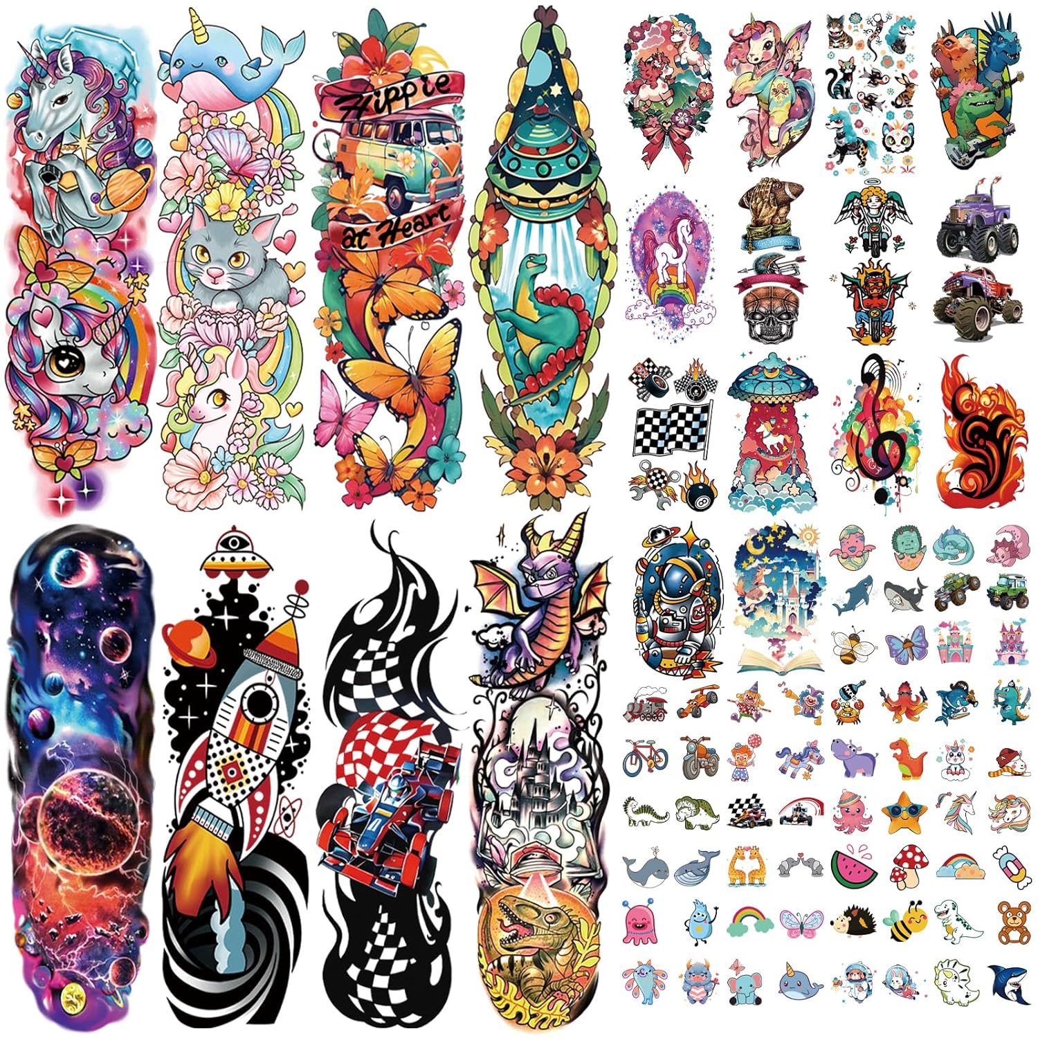 52 Pcs Temporary Tattoo for Kids Full Arm Unicorn Butterfly Cat Truck Dinosaur Rocket Cute Animal Body Face Fake Arm Tattoos for Girls Boys Tiny Tattoo Stickers Birthday Gifts Party Supplies
