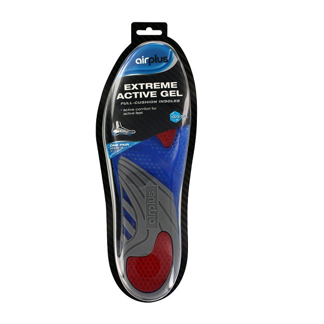 The Airplus Extreme Active Gel Insole absorbs shock with every step. Its lightweight and breathable design fits into any shoe, providing your feet with cushioning and support. The full-length insole offers additional support throughout the foot, including the heel, arch, and ball-of-foot, with dual colour gel at impact zones. Gel arch support increases stability and comfort with every step.