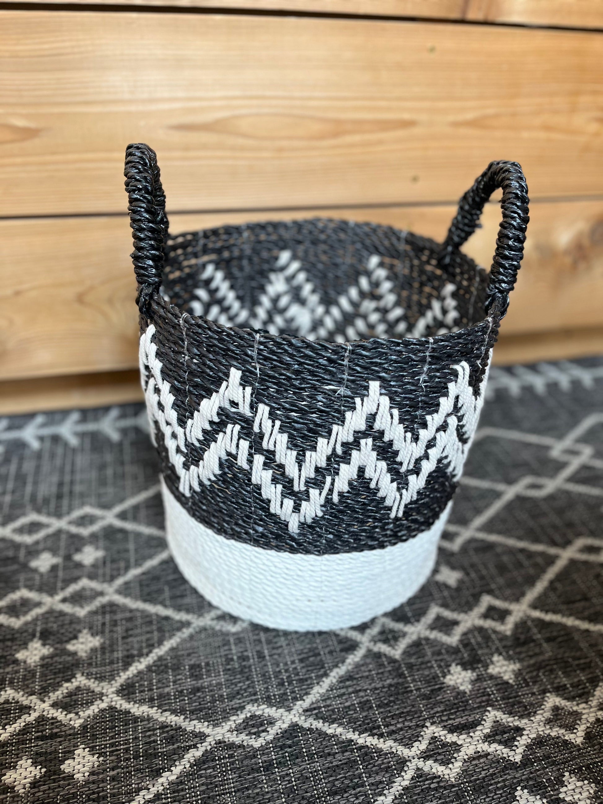The perfect combination of modern and bohemian styles for your home décor. These baskets instantly enhance any space with its vibrant flair and striking patterns. Delicately hand-braided in Indonesia by skilled artisans applying the perfect blend of seagrass fibers and cotton thread materials for superior style. These decorative baskets showcase a mixture of chevron motifs and elegant geometric figures in a natural base with black and white accents. The ideal decorative asset to place in your laundry room to organize clothes, bedsheets, or linens.