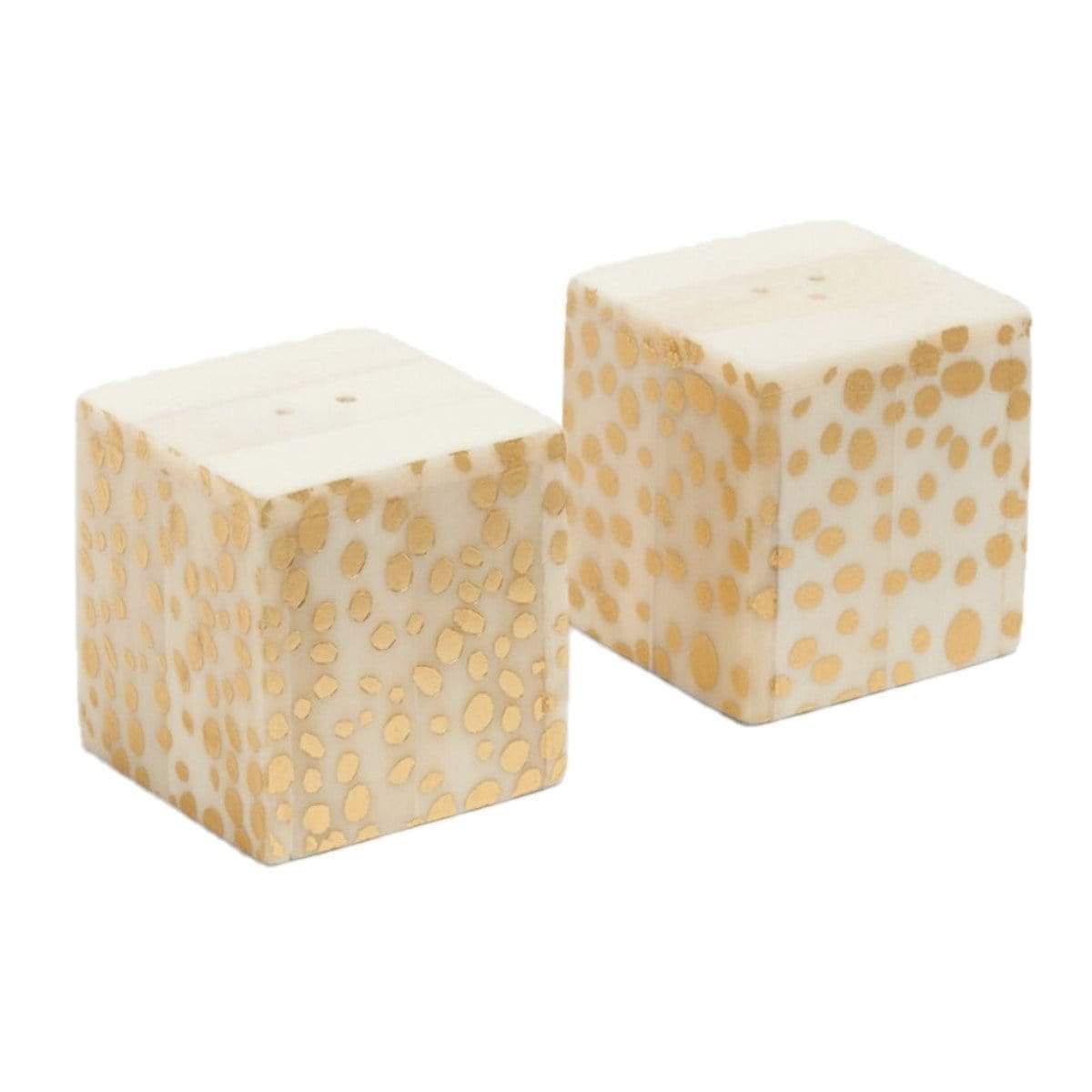 Our Dermott salt-and-pepper shakers are elegantly enwrapped in bone with spotted gold.