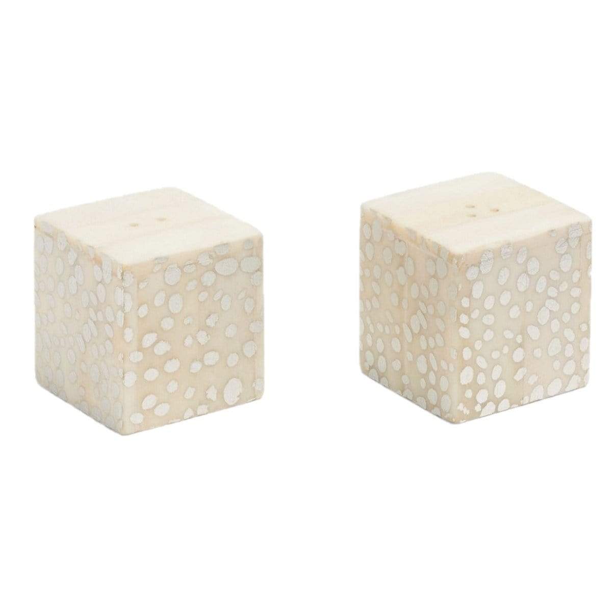 Our Dermott salt-and-pepper shakers are elegantly enwrapped in bone with either spotted silver.