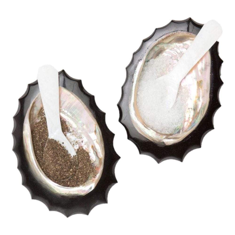 Abalone shell pinch bowls set in ridged black resin with miniature serving spoons. Natural variation to be expected.