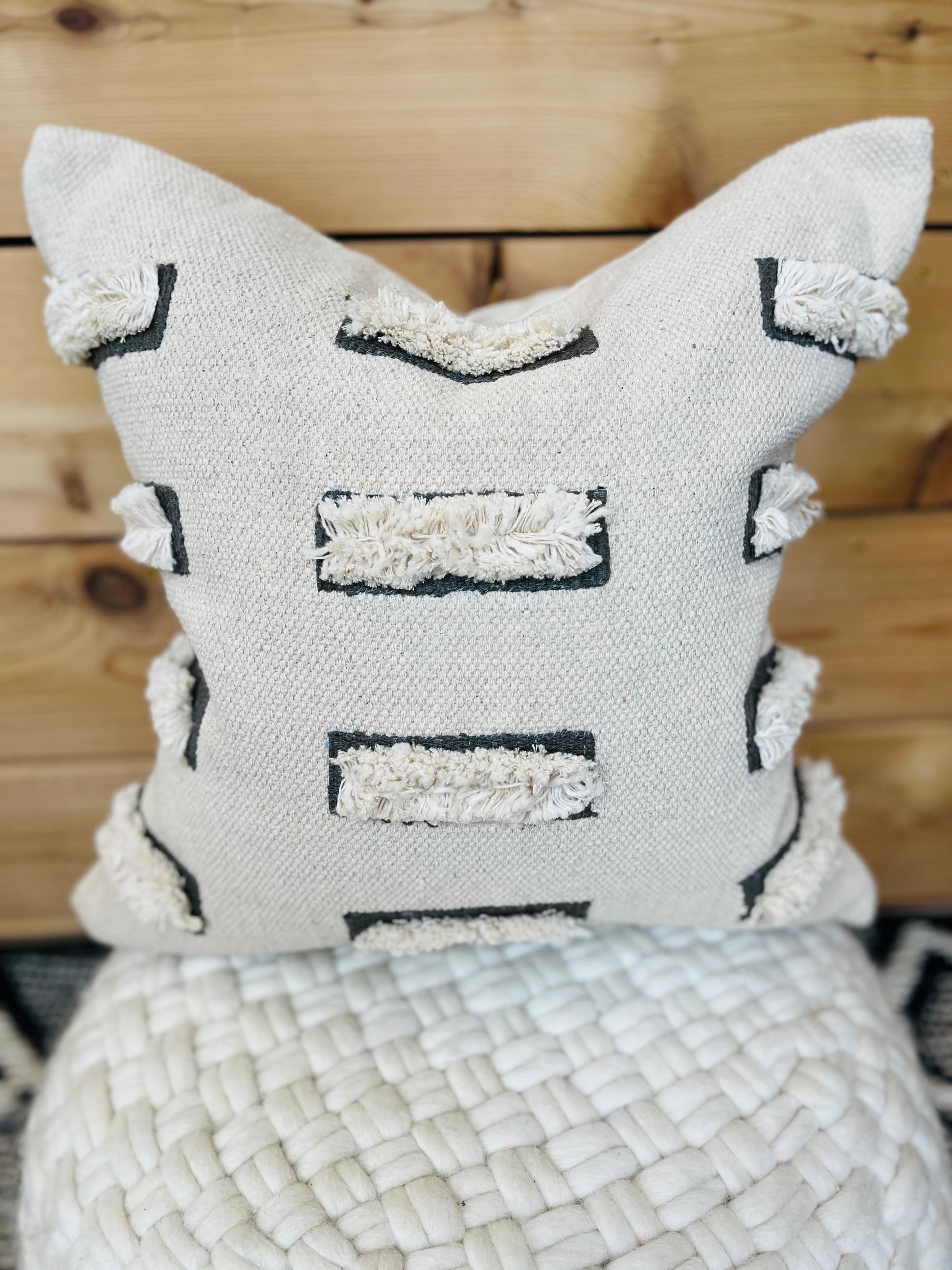 This pillow is made out of woven cotton, with a beige and grey design on the front and a solid white back.