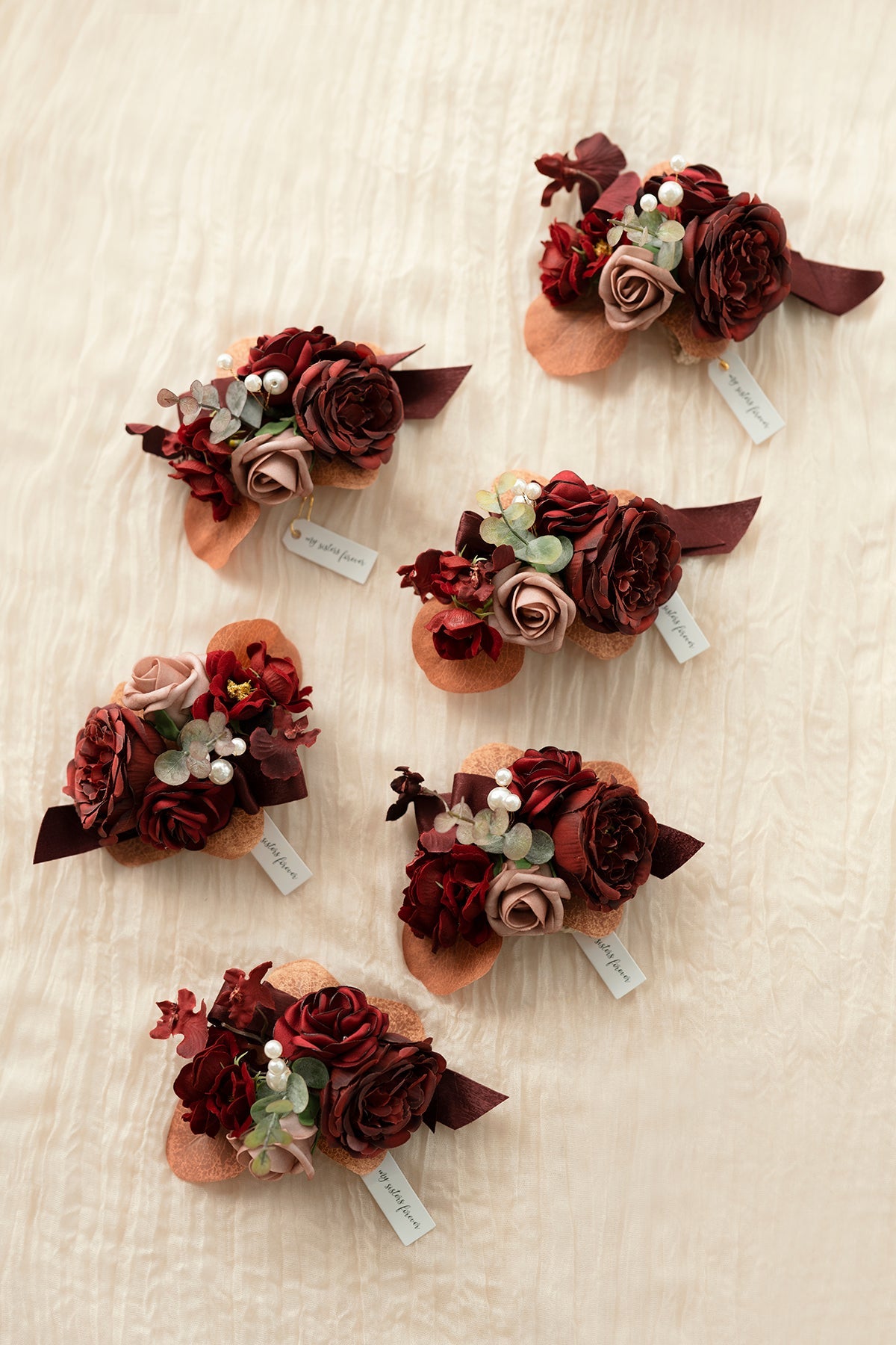 The elegant wrist corsages are made up of burgundy silk Austin rose, burgundy silk camellia, burgundy phalaenopsis, dusty rose foam rose bud, accented with pearl floral pick, dusty rose eucalyptus leaves, etc. - Notes: These foam flowers are handmade. Please understand that the size may vary slightly and there might be a slight color difference between different dye lots. There might be a little deformity during handling, storing, and transportation. Please adjust the flowers to recover their shape after receiving them.