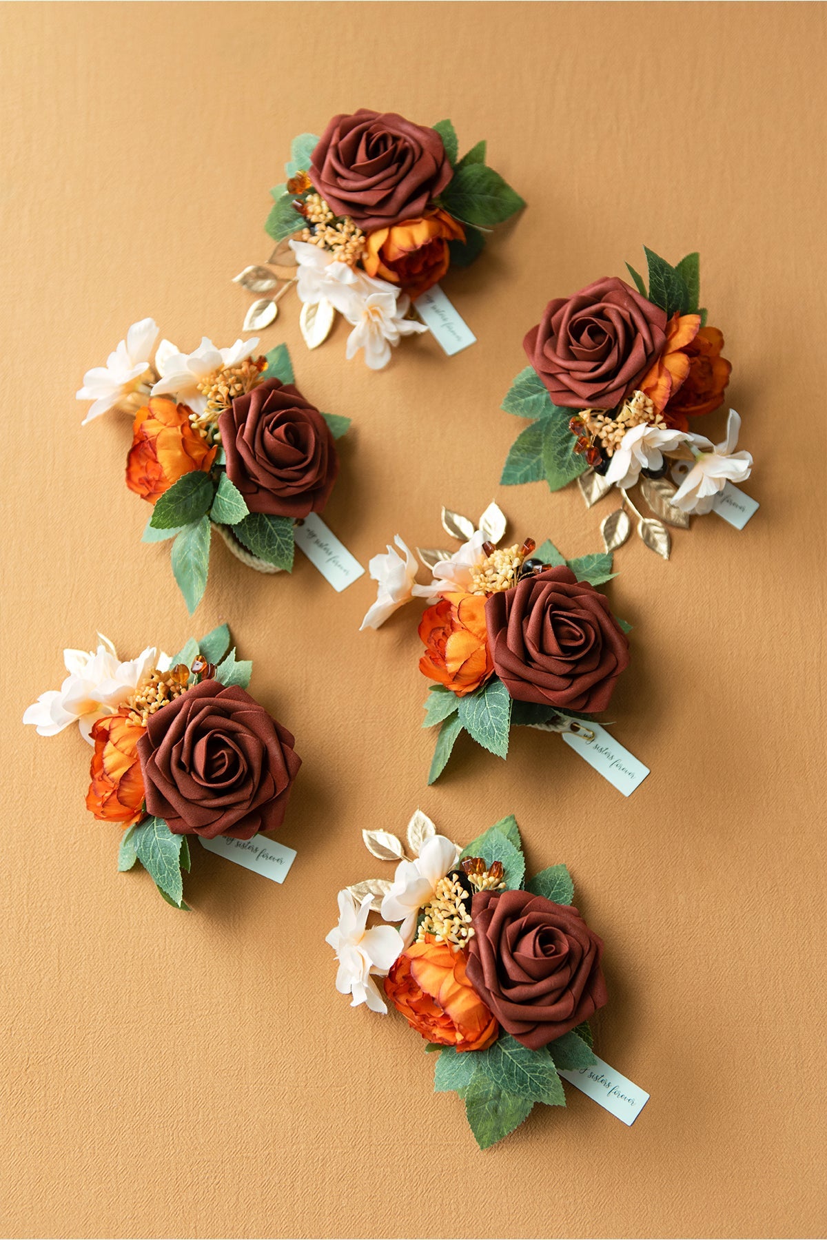 - Material: The elegant wrist corsages are made up of artificial burnt orange foam rose, cream delphinium, terracotta petite peony, accented with golden leaves, sage rose leaves and Holly fruits. The corsage wristlet is filled with burnt orange and cream color details!