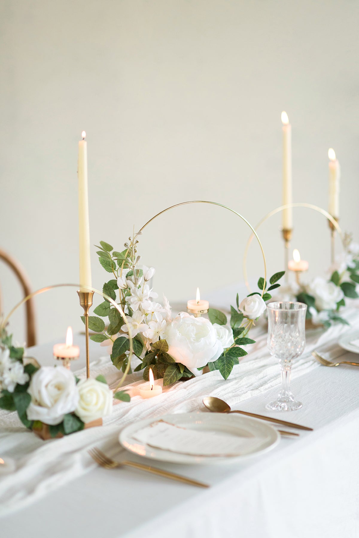 - Material: The flower arrangement is mainly made of silk/foam flowers, including real-looking ivory pony, ivory Escimo rose, ivory rose, white rose, and white delphinium, dotted with some greenery. The holders are made of high-quality gold ring candle holders and wooden bases.