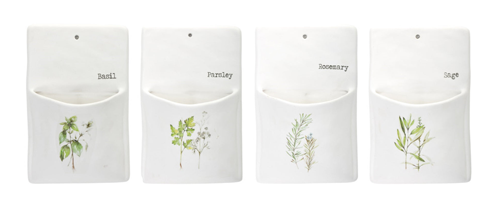 Decorate your walls with this fashionable set of Herb Wall Pocket planters. The collection includes four different designs: basil, parsley, rosemary, and sage. This piece's simple white design, combined with the exquisite artwork, makes it a fantastic accent to any kind of home decor. The high grade composition will last for several seasons. Finish the artwork by inserting a genuine or imitation plant into each pocket.