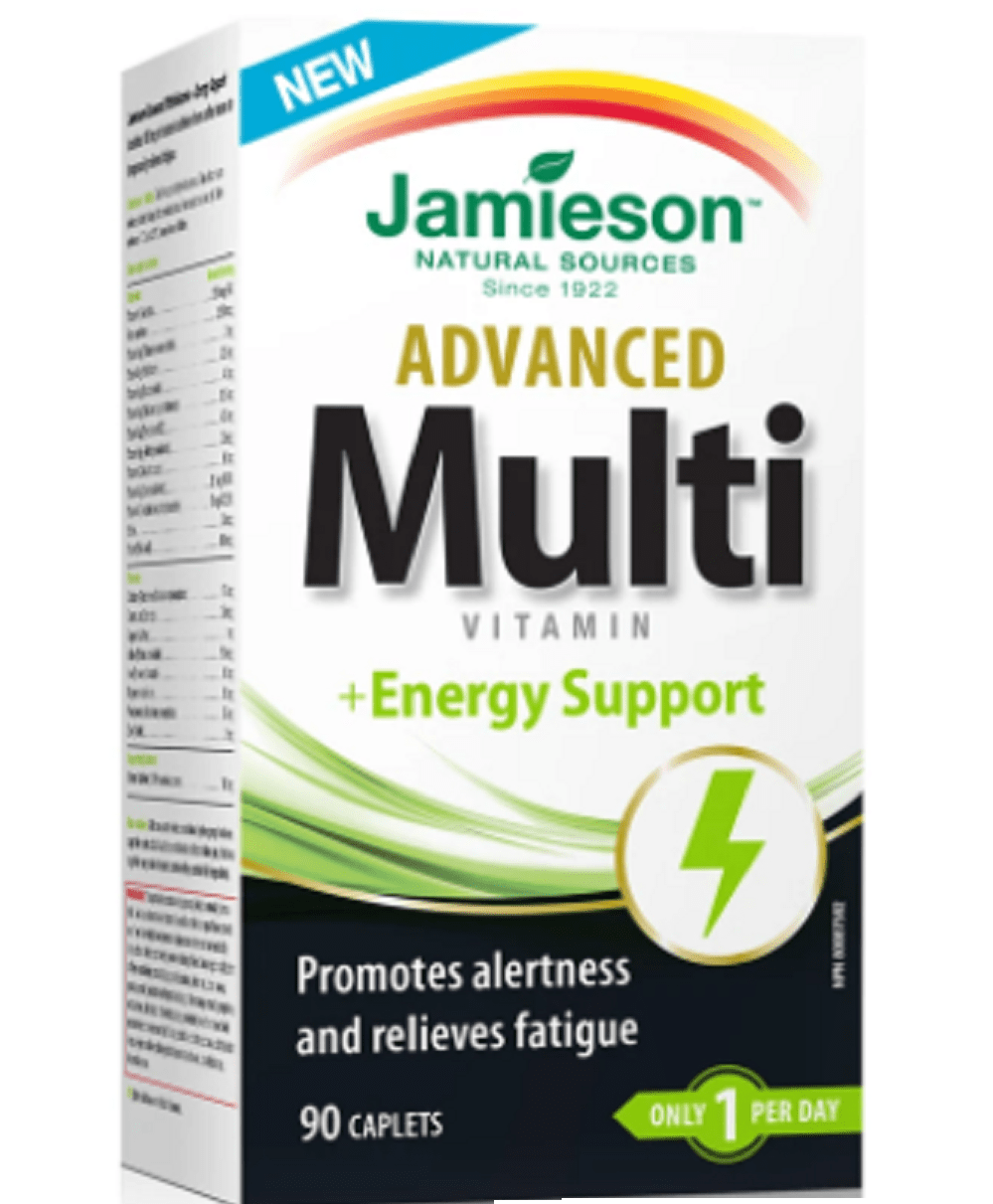 Jamieson Advanced Multi + Energy Support is the easy way to get 100% of your body's daily vitamin needs. Formulated with 100 mg of natural caffeine from coffee beans, this daily multivitamin temporarily relieves fatigue and promotes alertness.