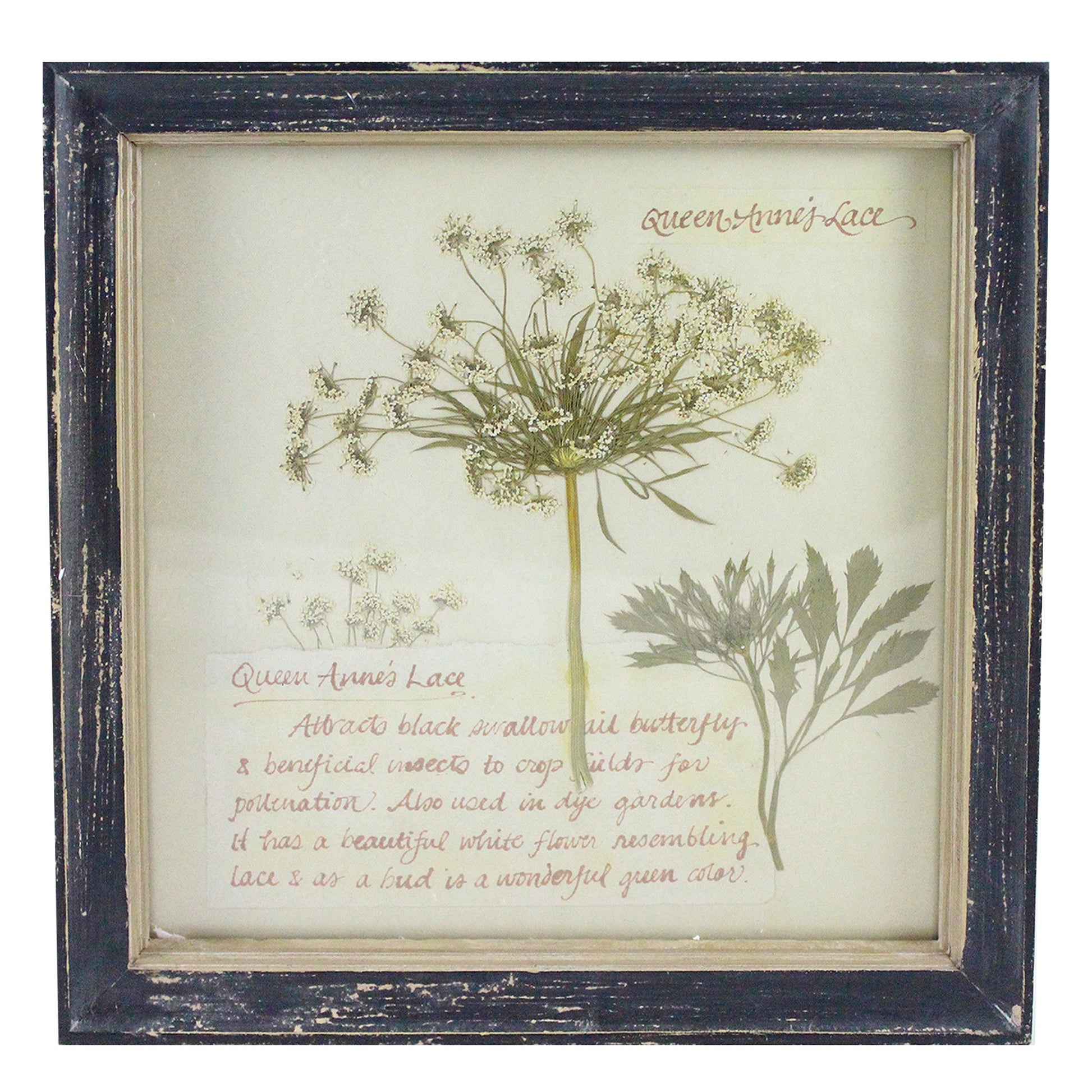 Decorate your home with this rustic wooden framed piece of artwork that features queen's Anne's lace flowers. Along side the real flowers is an antiqued scripted paragraph describing facts about the elegant flower. This piece is perfect as a house warming gift.