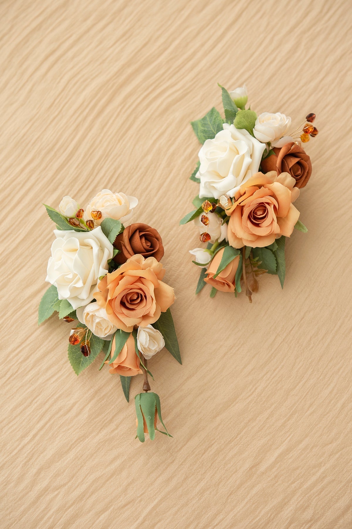 - Material: The elegant shoulder corsages are made of artificial champagne camellia, terracotta rose, foam orange rose, and foam cream rose, accented with eucalyptus leaves, amber beads, etc.
