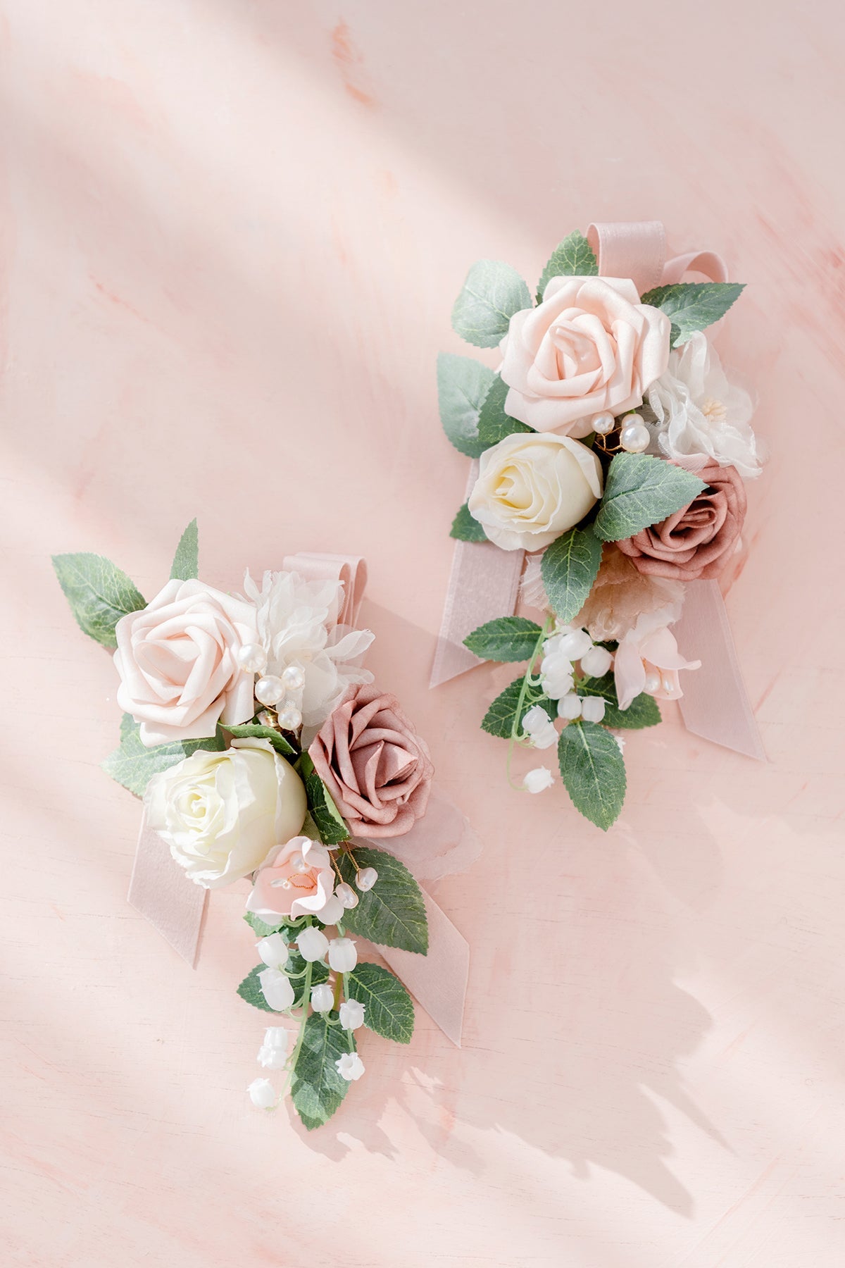 - Material: The elegant shoulder corsages are made of ivory real-touch rosebud (a rose that has the shape of a fresh flower's touch and is very similar to a fresh flower), dusty rose foam petite rose, nude foam petite rose, white silk anemone, blush foam gardenia bud, lily of the valley, white gauze flower, accented with sage green rose leaves, pearl floral pick.