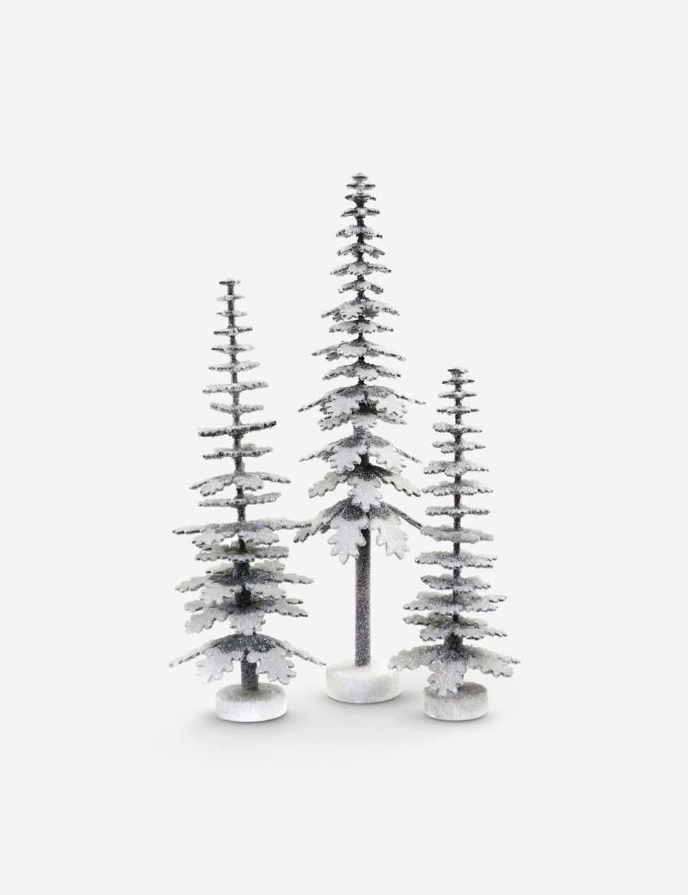 Bring a touch of seasonal whimsy to your console or mantel with this set of snow-covered trees. Each set features three trees in varied sizes and a glittery finish that will set off your holiday decor with a playful glimmer.