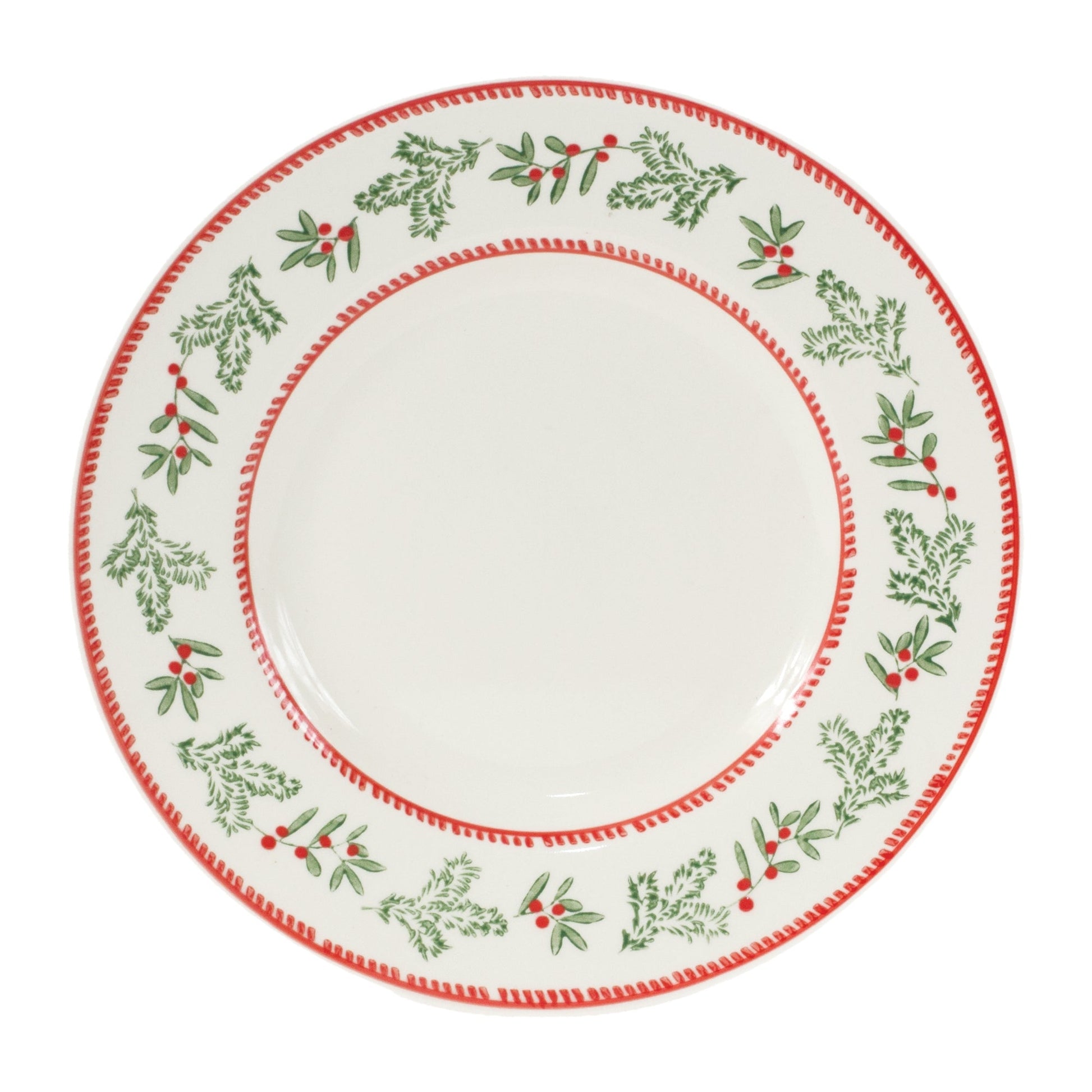 With this collection of four Mistletoe Plates, you can bring your holiday decor to life! These stoneware plates have a white finish with red accents and a stunning painted mistletoe & pine branch motif. Traditional holiday decorations will brighten any home and make your guests feel welcome. Get your Mistletoe Plates today to add a festive touch to the holidays!