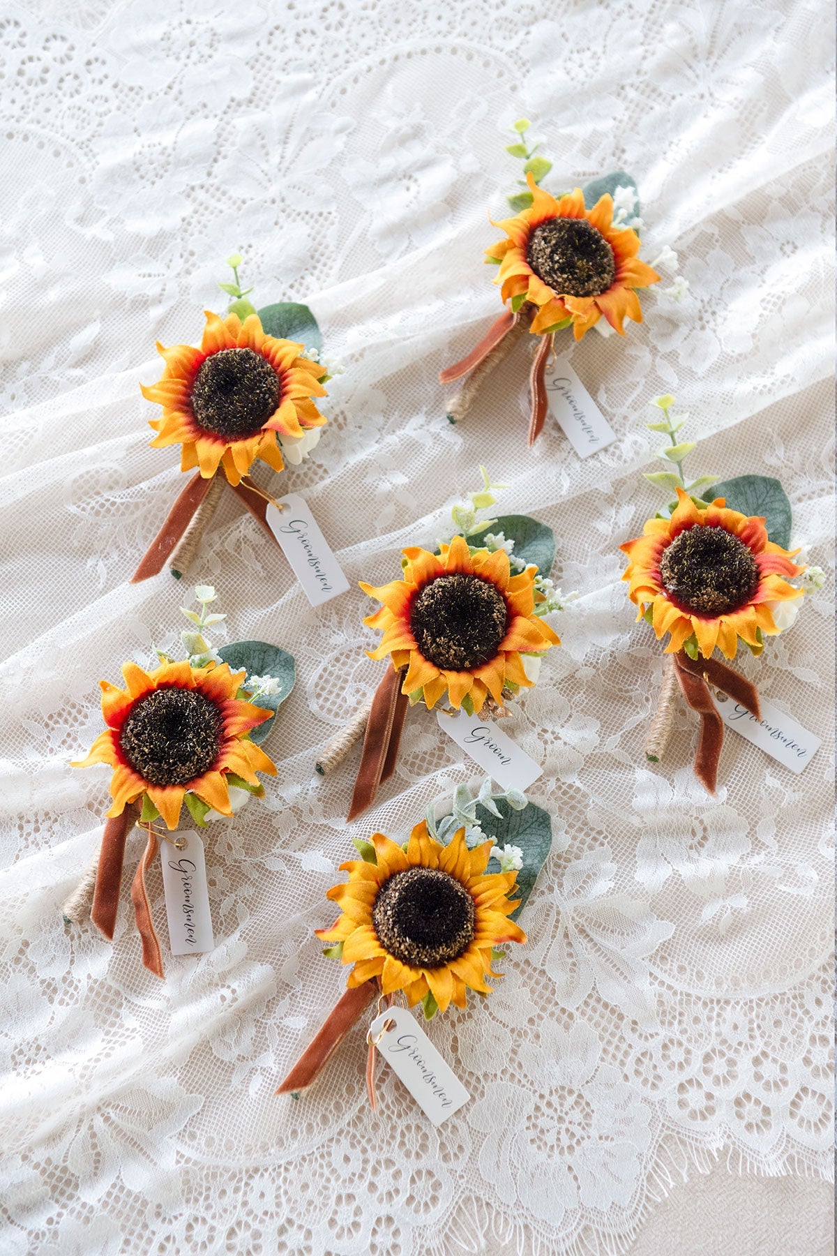 - Great Value: A set of 6 sunflower boutonnieres may fit the number of the groom and groomsman. The exquisite boutonniere with gold leaves may stand out to the groom.