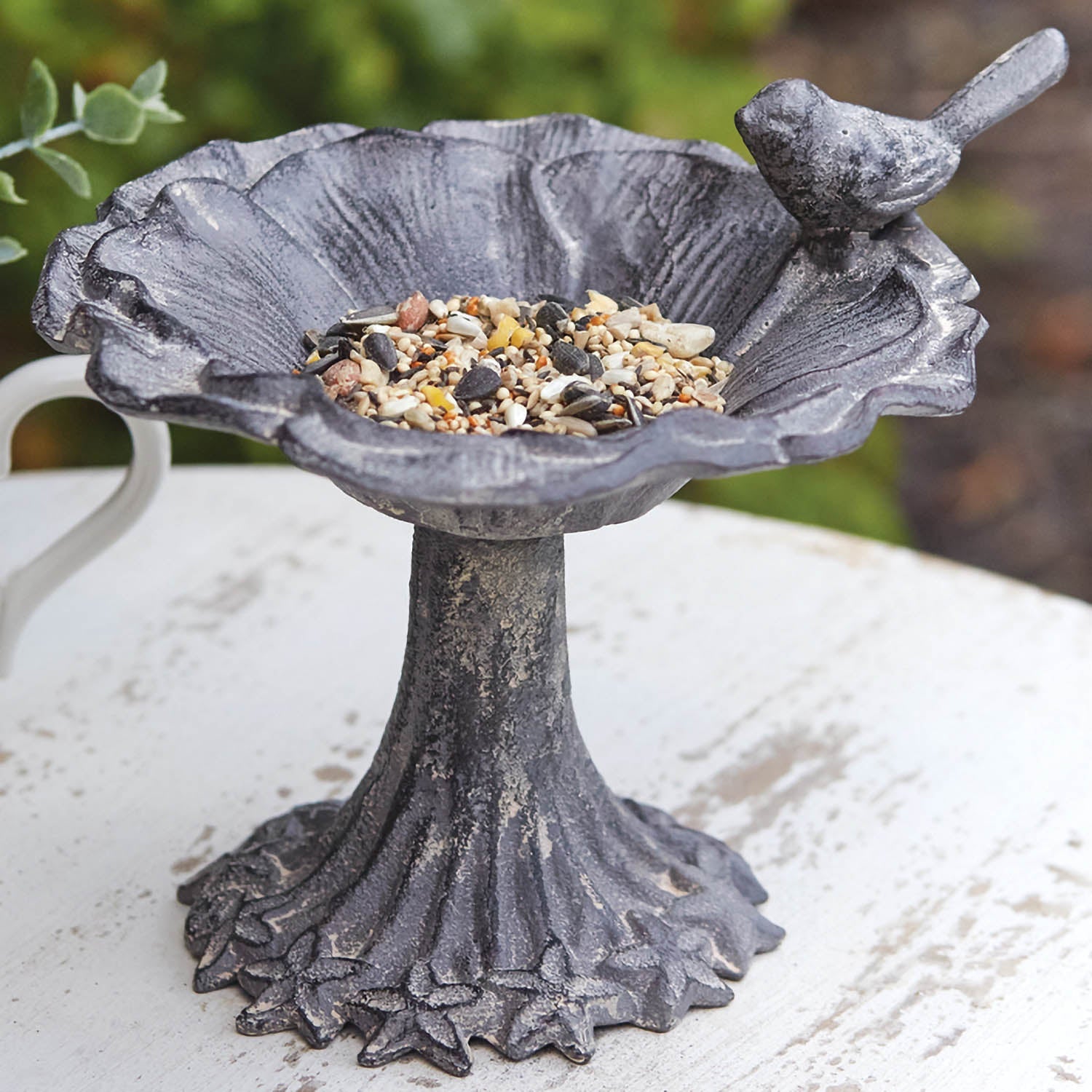Treat your feathery friends with birdseed inside this tabletop feeder. Fashioned from cast iron, this item will withstand all the outdoor elements. Item can be used indoors with candles or other small items as well.