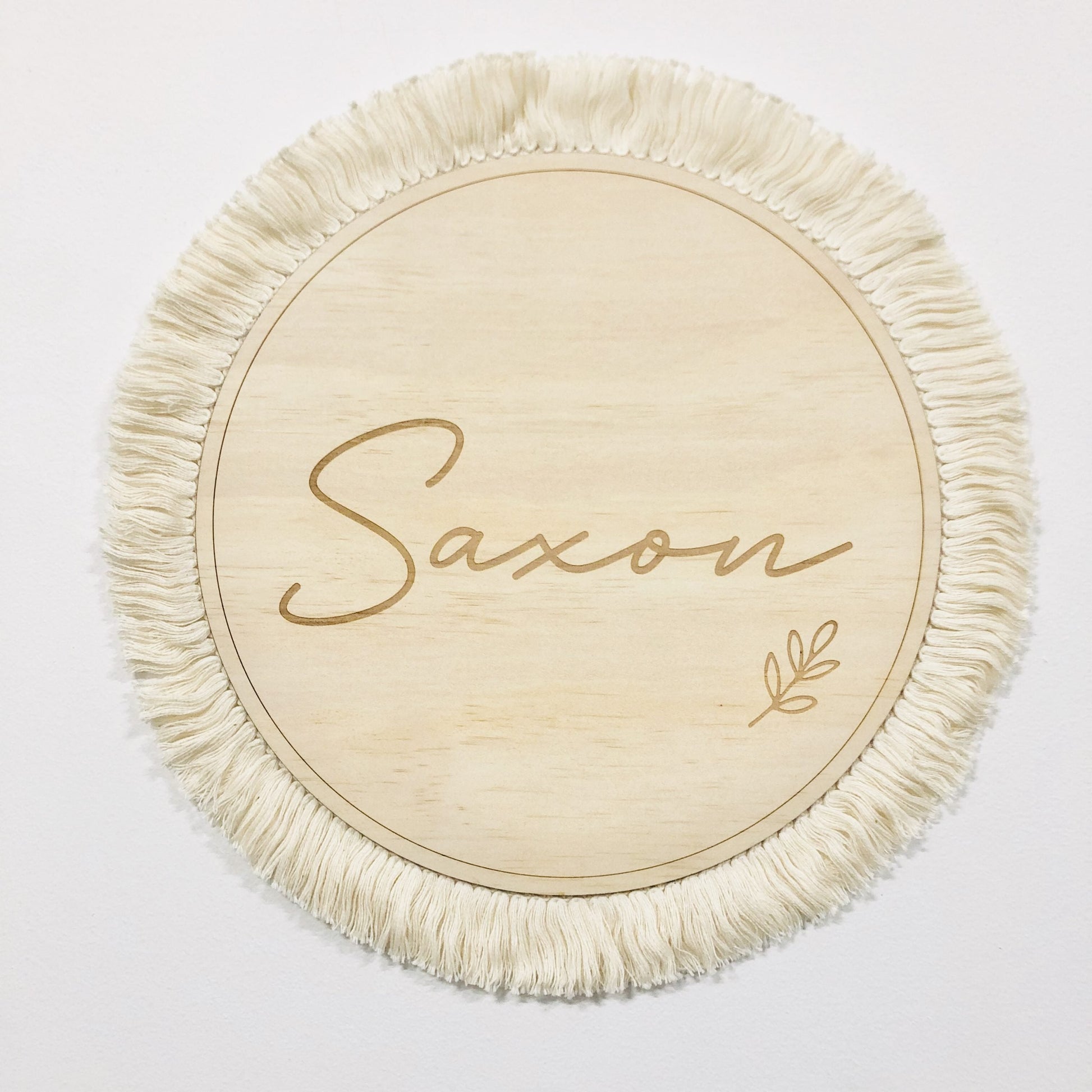 This beautiful round wood sign is the perfect accessory to any room. This sign comes with our signature botanical detailing engraved at the bottom with beautiful imported fringe around the outside.