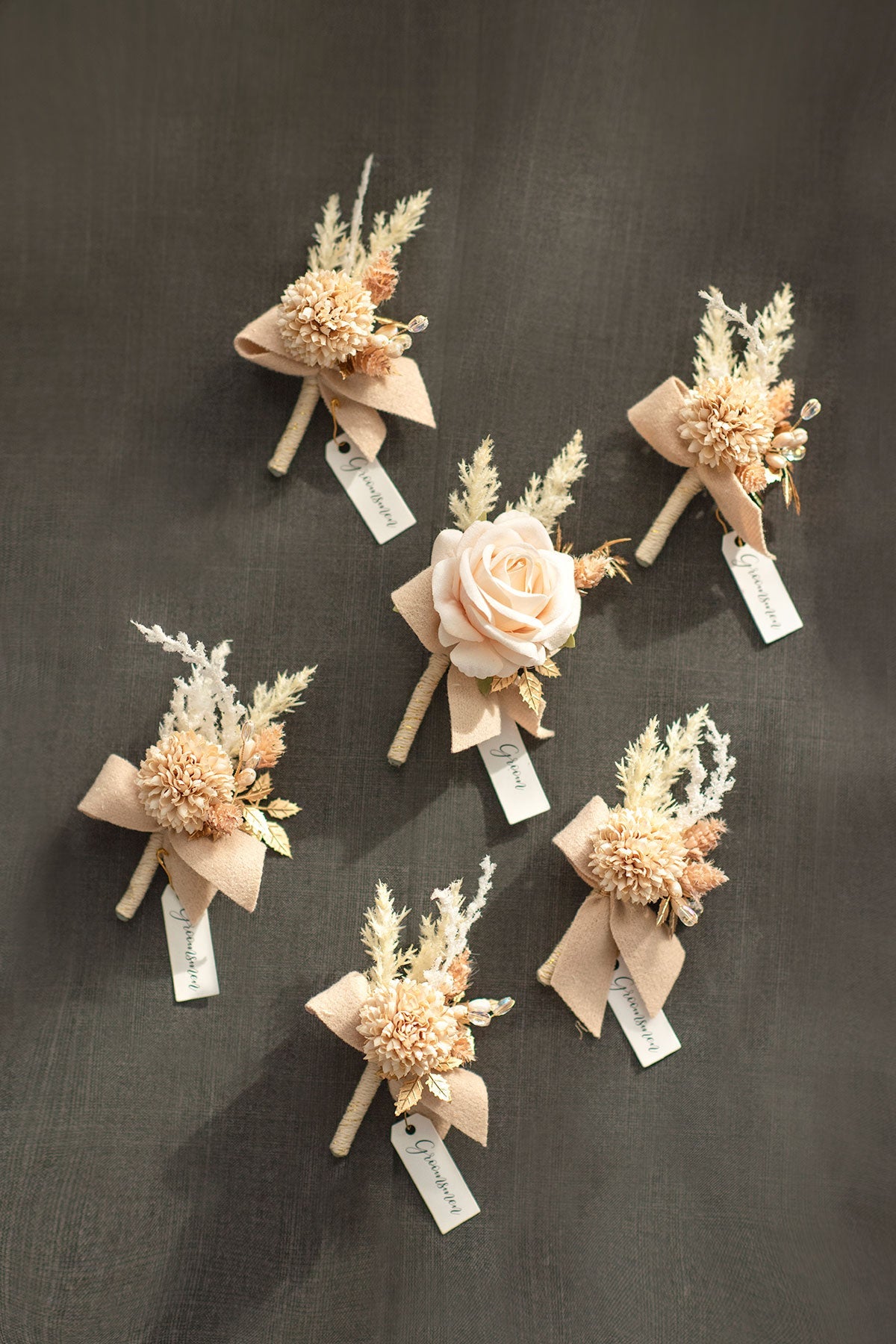 - Great Value: A set of 6 boutonnieres may fit the number of the groom and groomsmen.