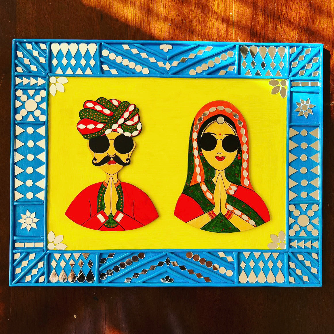 Lippan Art Wall Hanging - Add a touch of traditional elegance to your home decor with this handcrafted welcome couple Lippan Art piece. Made using clay and mirrors, this wall hanging is traditional mural craft of Kutch, Gujarat known as Lippan Kaam. Its bright colors are sure to grab attention and create an ambiance of sophistication in any room it's displayed in. Whether it's for your living room, drawing room, or bedroom, this wall hanging is perfect for adding a touch of Indian charm to your space. Lippan art also makes for an excellent gift for housewarming, Thanksgiving, Christmas, Diwali, or any other special occasion. Bring home this beautiful piece of Lippan Art Wall Hanging today.