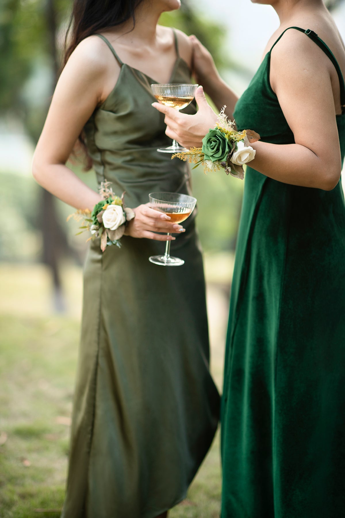 - Material: Wrist corsage with beige elastic bands, easy to wear, comfortable and firm, fits most wrist sizes. The elegant wrist corsages are made up of jade foam petite avalanche rose, cream foam petite rose, and ivory pompon accented with dried rose leaves and fern leaves.
