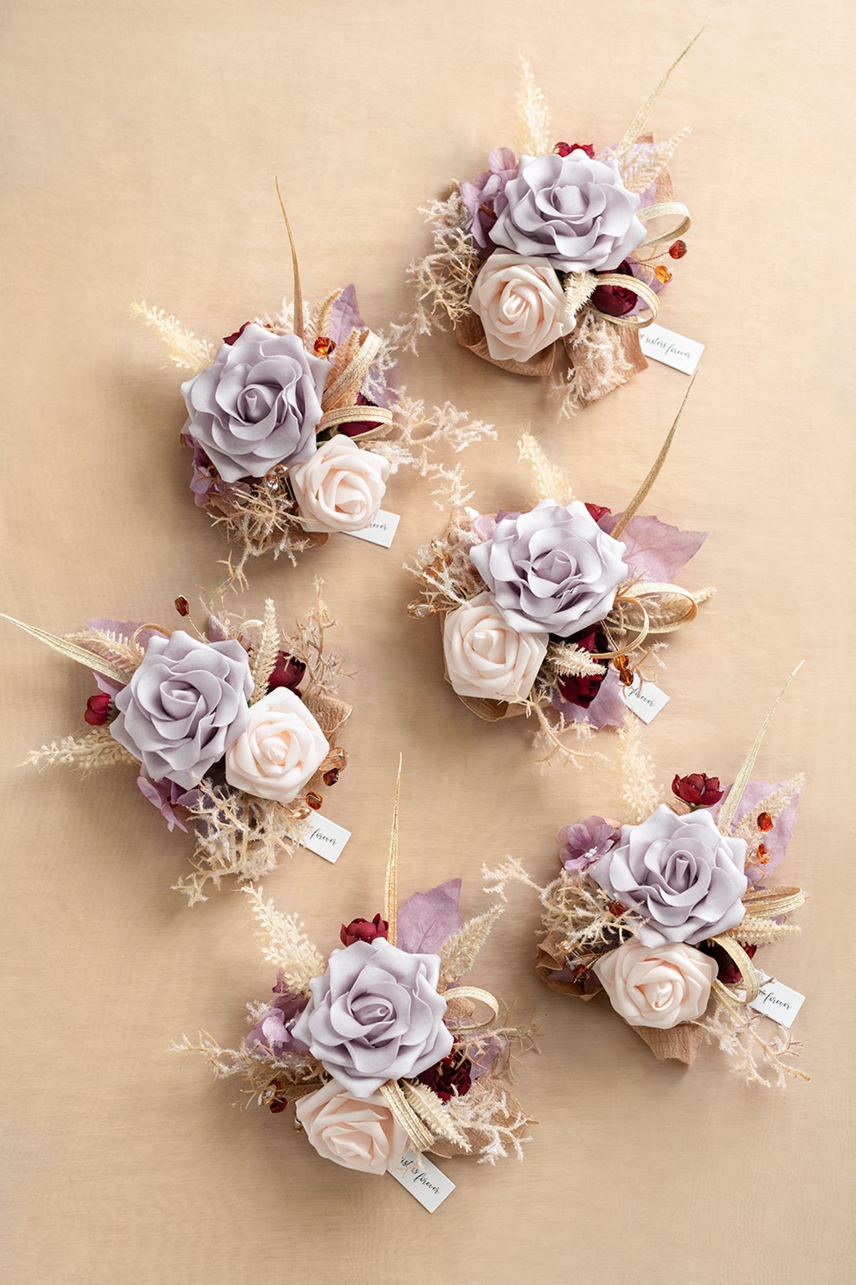 - Material: The wrist corsages are made up of artificial lavender aster gardenia, cream pink rose, camel fog pine, fall lavender aster vintage hydrangea, ear of rice, dotted with off-white reed, amber crystal floral pick.