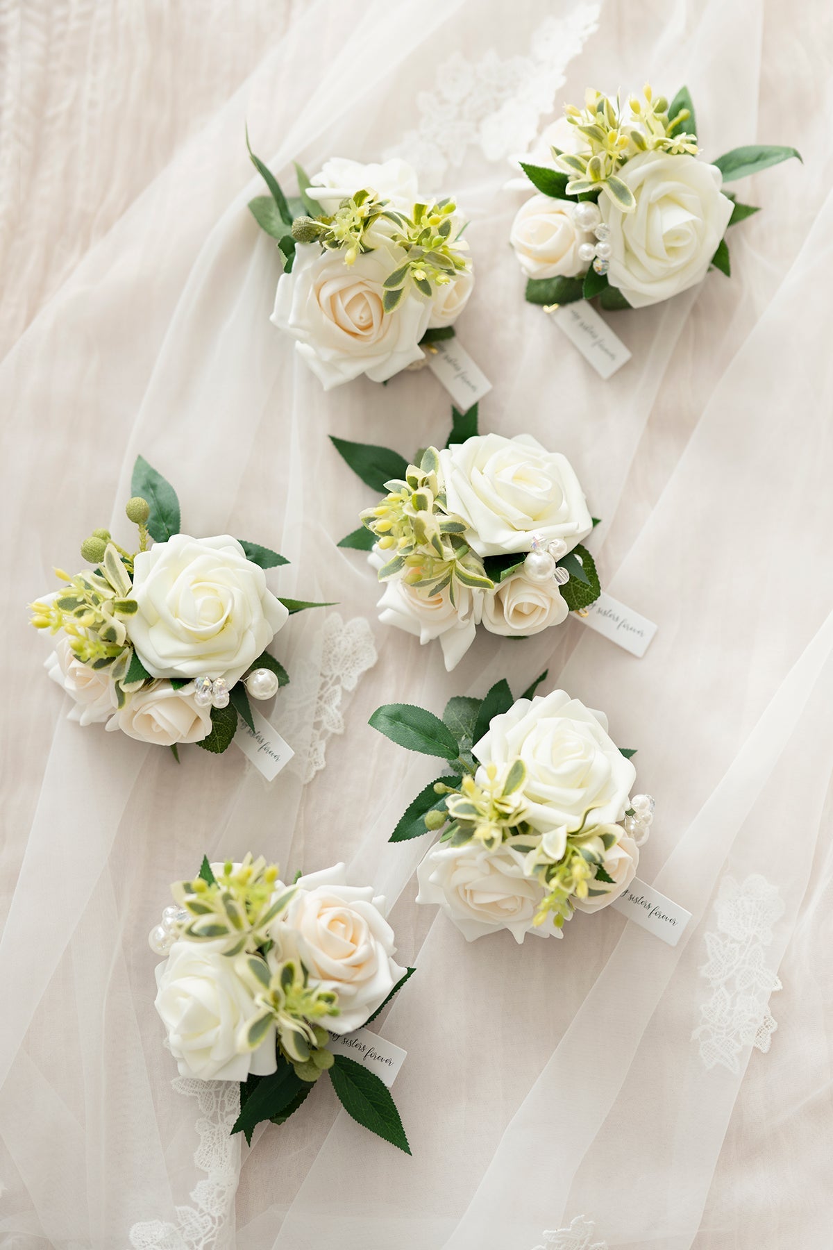 These beautiful corsages are designed for bridesmaids, the mothers of the bride and groom, grandmothers, and any other special female family members or friends. The stunning combination of ivory and green will bring warmth and memory to your wedding in any season.