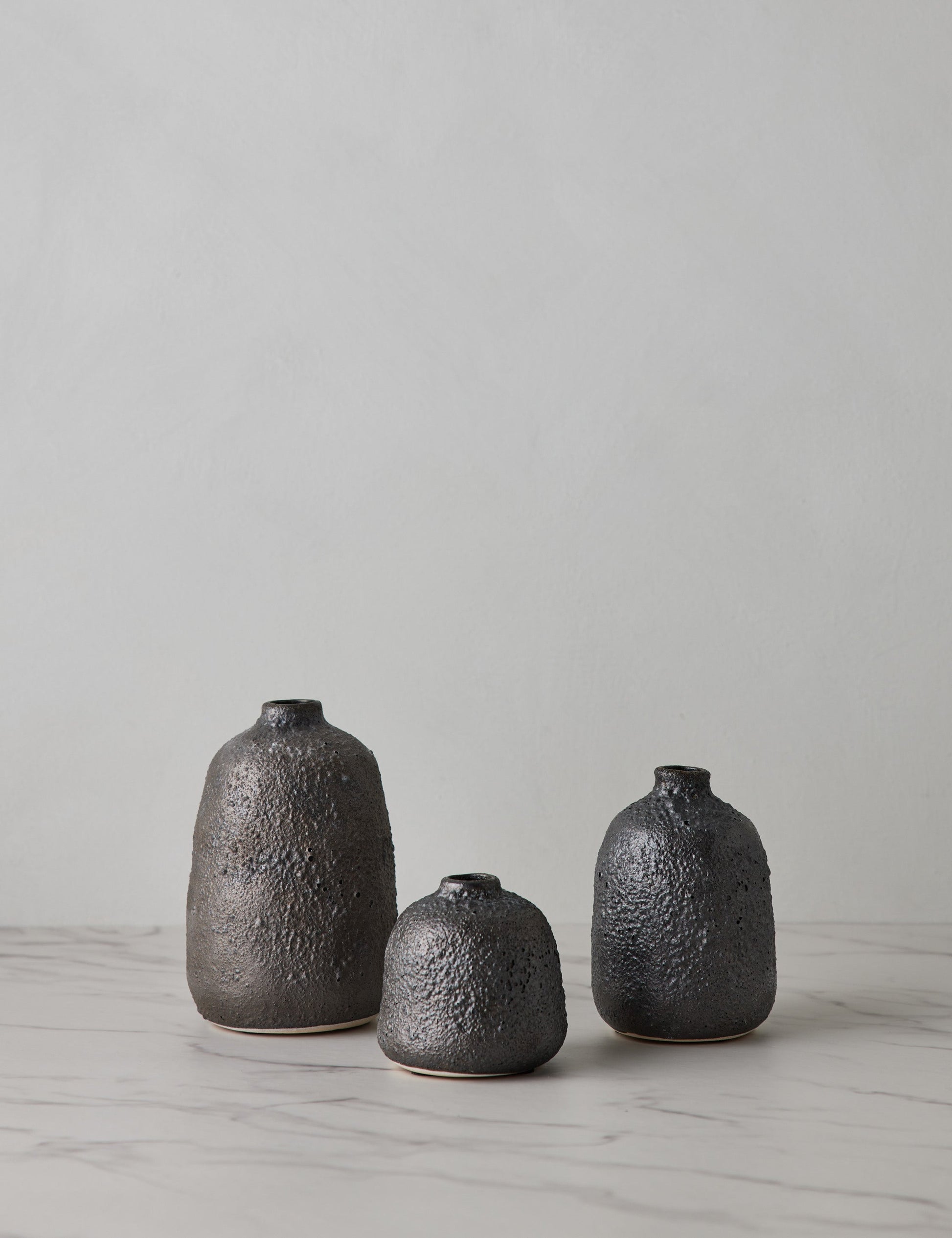 Bring a moody, earthy element to the timeless forms of this vase set with a dark, tactile finish. Crafted from terracotta, these vases can be styled individually with a single stem or leafy green, or be clustered together atop a coffee table or console.